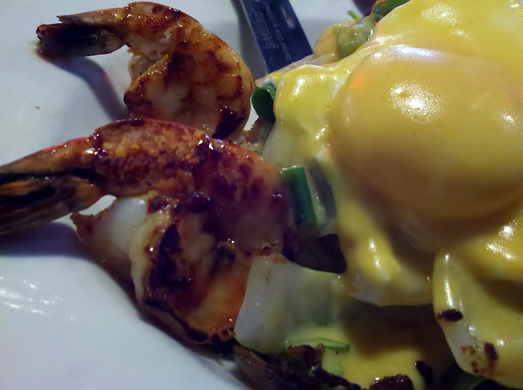 Breakfast for Scott today was from the daily Special’s Board – Chipotle Honey-Grilled Shrimp Benedict with baby spinach, smoked onions over warm cornbread with a scallion hollandaise.  Accompanying this dish was a side of Beer Bratwurst Hash which included white beans, Swiss cheese and caramelized onions. The unique spice profile of the shrimp was so unique that I had to reluctantly share them with another RhodeCrew member because flavors this good must be communal. The poached eggs were cooked perfectly, and it was such a nice change to have it served on a bed of fresh-baked cornbread instead of the usual English muffin. This hash was also another unique treat that we doubt you will find anywhere else.