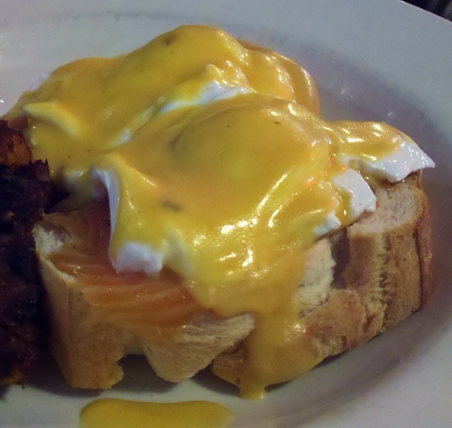 “We smoke our own salmon,” Sam said, as David ordered the Nova Scotia Benedict faster than you could say “lox.” This beautifully smoked and sliced happiness was carefully laid out across freshly thick-cut Italian bread and topped with two perfectly poached eggs with a smooth and creamy hollandaise blanketing it all. Although a plain potato hash accompanies breakfast, he chose the Bleu Cheese-Spinach specialty hash from the menu. The chef starts with the traditional grilled hash and incorporates the specialty ingredients before browning it on all sides. What a winner of a breakfast this turned out to be!